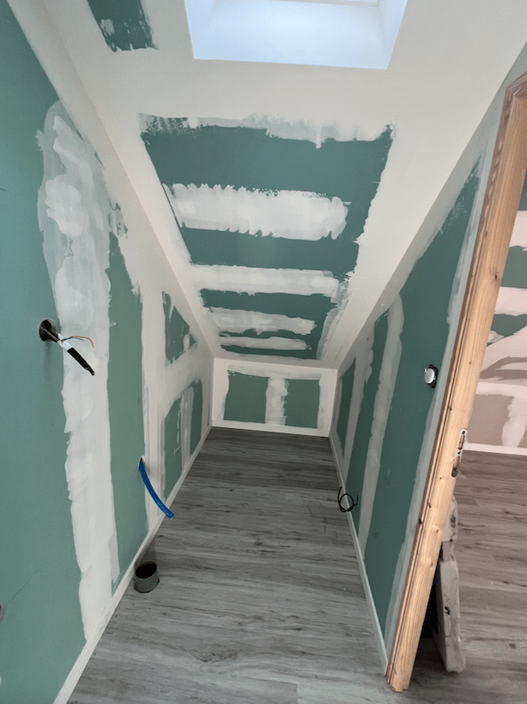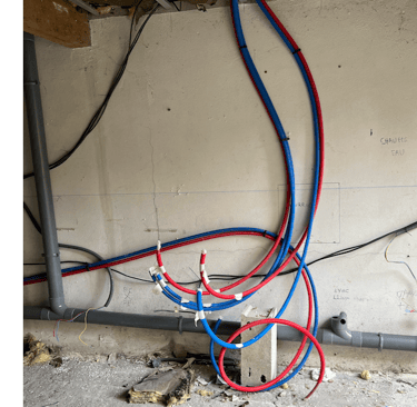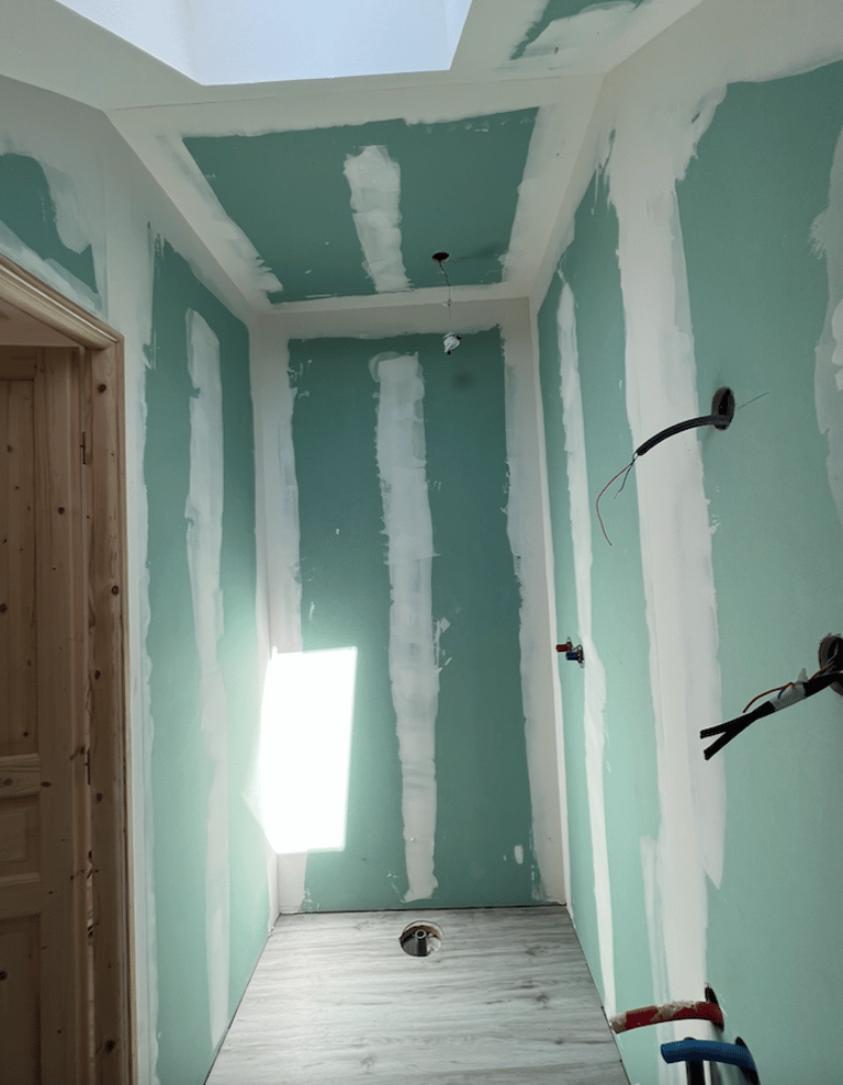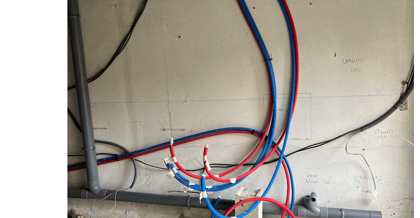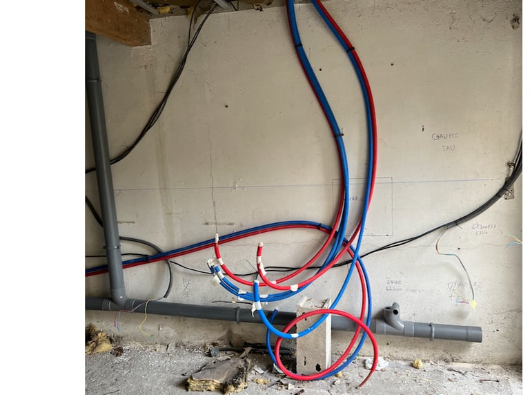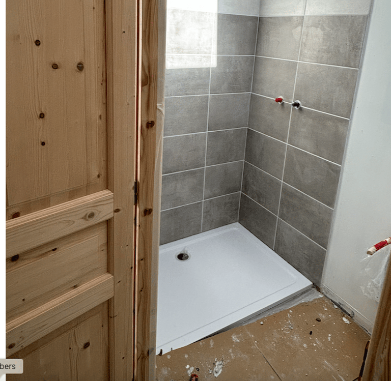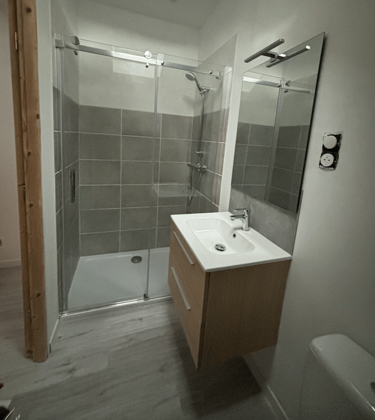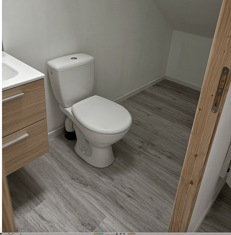 Notre client a transformé un ancien garage en une petite habitation. Pour cela, il a fallu créer une Salle de bain à l'étage, créer les alimentations et évacuations, installer des WC, etc.